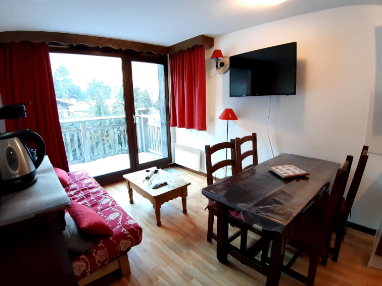 Comfortable apartment with a large balcony, a bedroom with a 160x200 bed and a pull-out bed (80x190), and a cabin area with bunk beds.