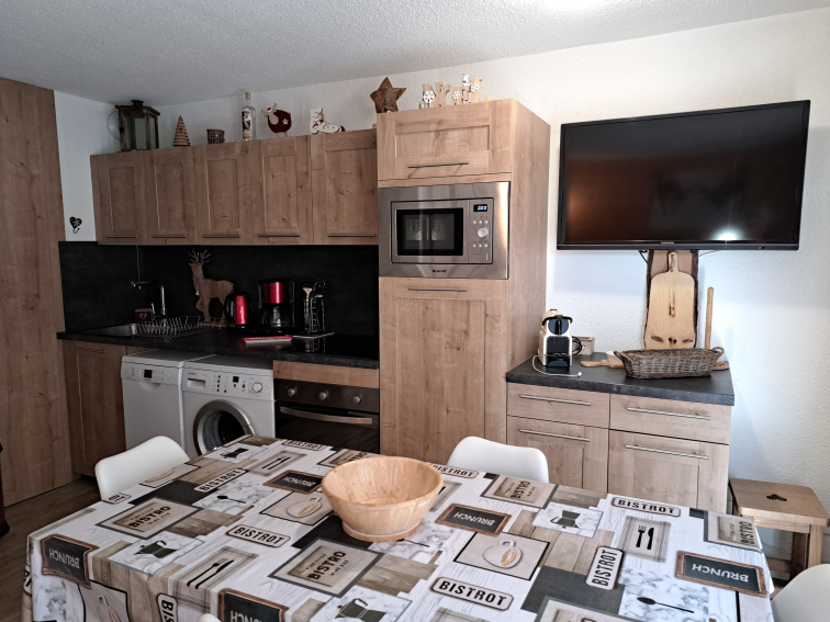 La cuisine est ouverte sur le séjour, entièrement équipée avec four, micro-ondes, lave-vaisselle, lave-linge, appareils à raclette et à fondue...Le séjour, à la décoration chaleureuse, est équipé d’un canapé Rapido confortable, d’un téléviseur grand écran, et de rangements spacieux.